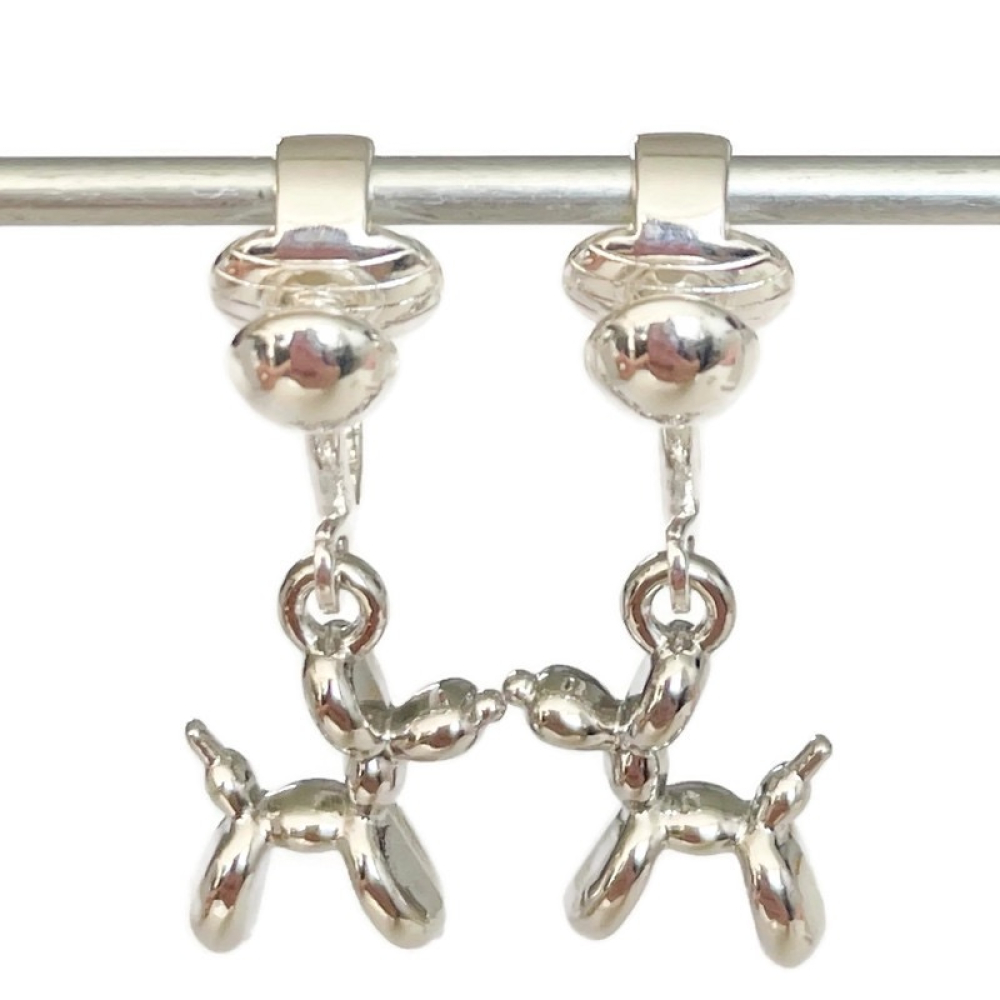 Clip oorbellen ballonnen hond zilver, hangoorbellen