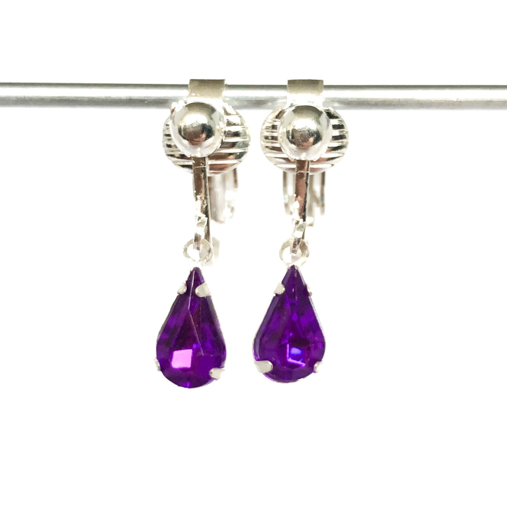 Leuke druppel-clip oorbellen met 1 paarse glitter erin.