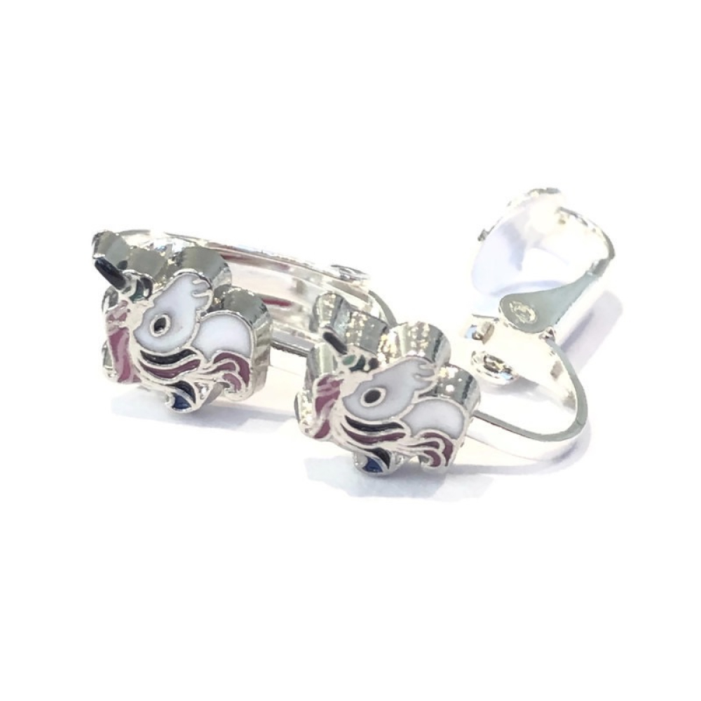 Superleuke clip oorbellen eenhoorn in het roze met zilverkleurige accenten.