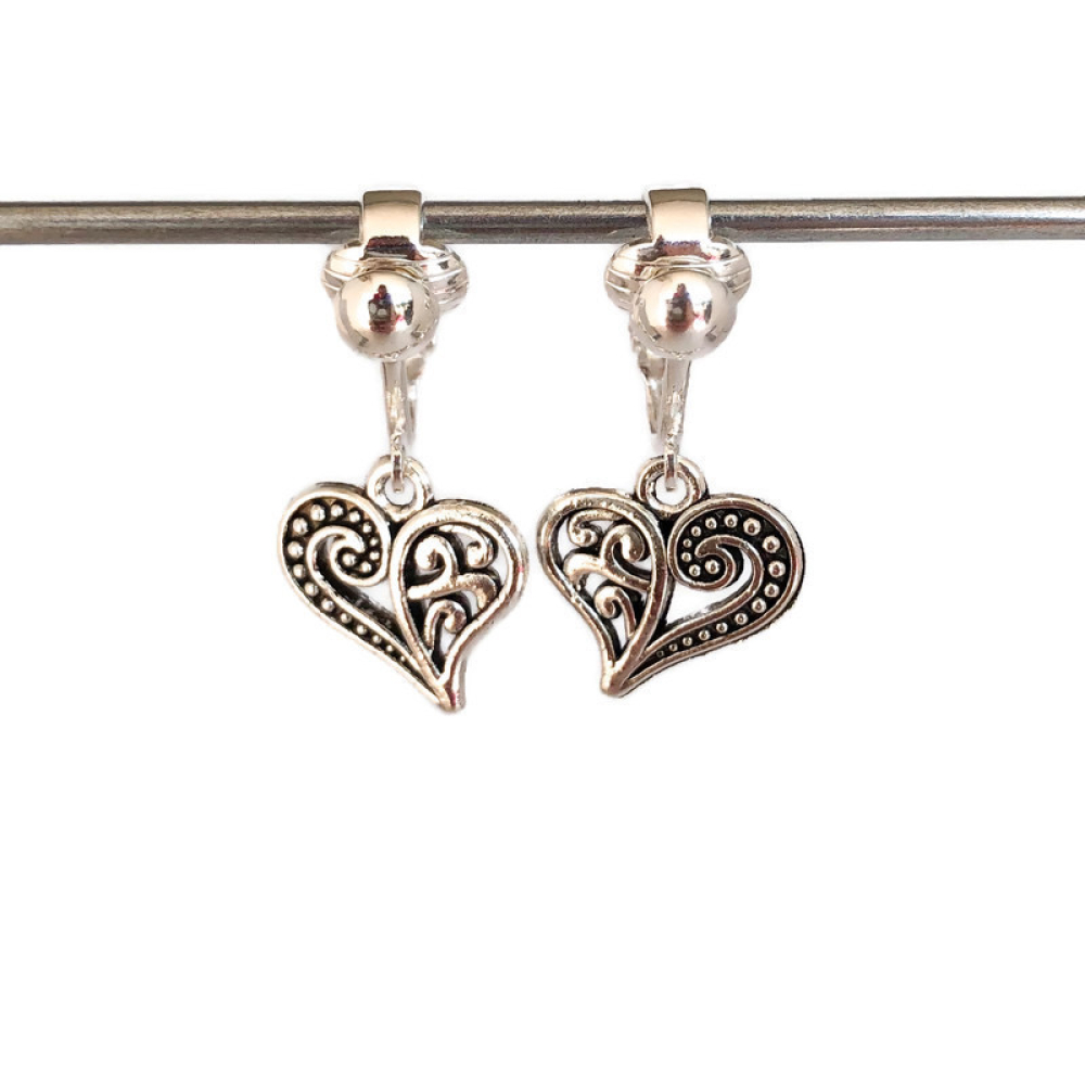 Clip oorbellen hartje Tibetaans zilver, hangoorbellen