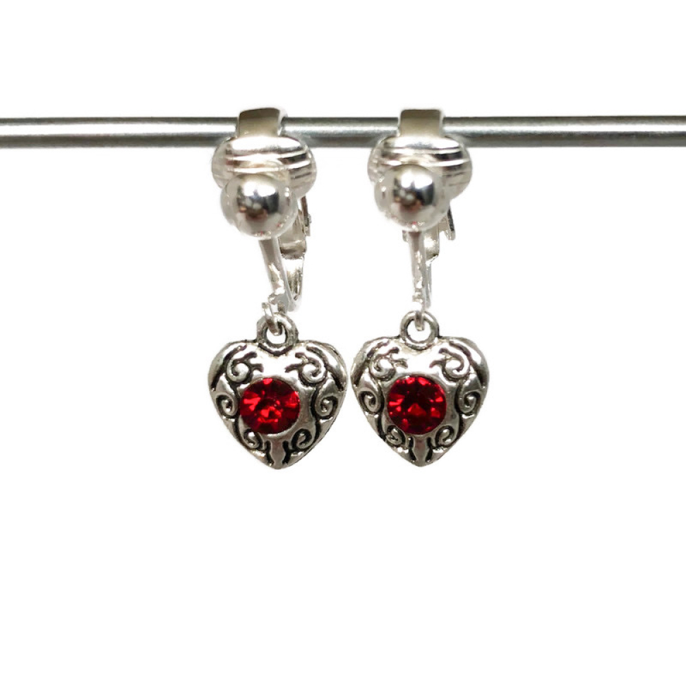 Clipoorbellen antiek zilveren hartjes met 1 donkerrood glitter, hangoorbellen