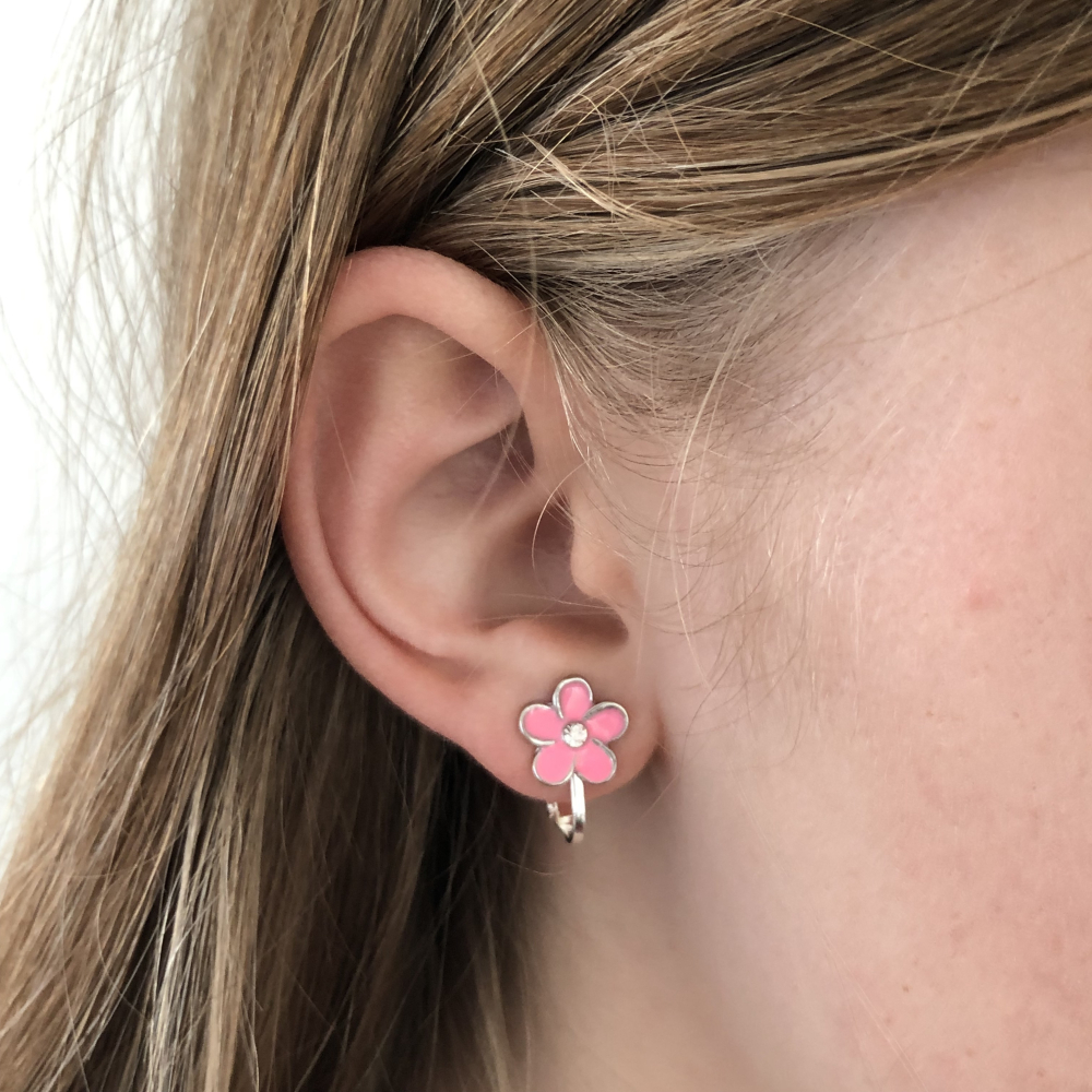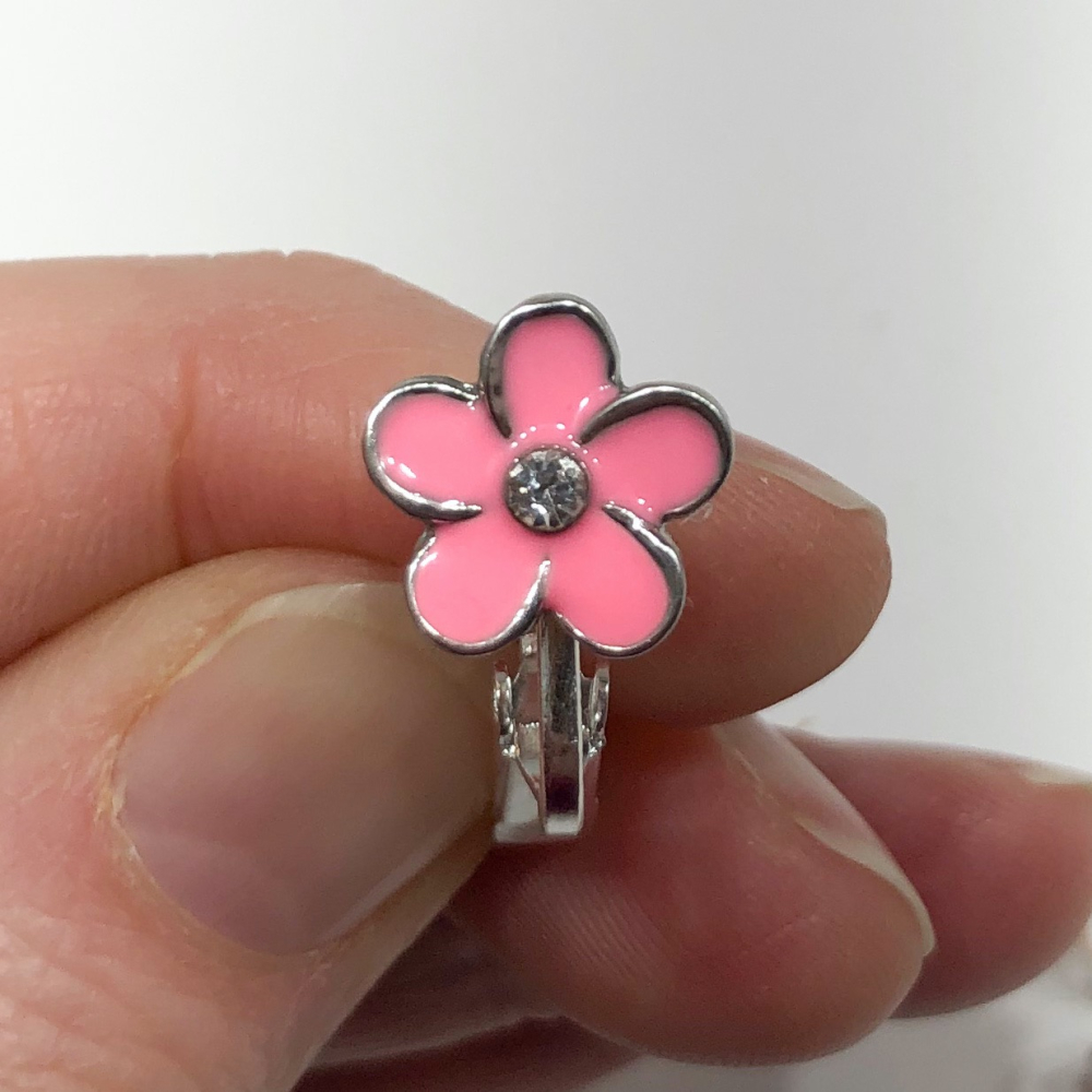 Dit clipoorbelletje is een knopje en hangt dus niet. De grootte van het roosje is ongeveer 1 cm en wordt gewoon op het oorlelletje geklemd.