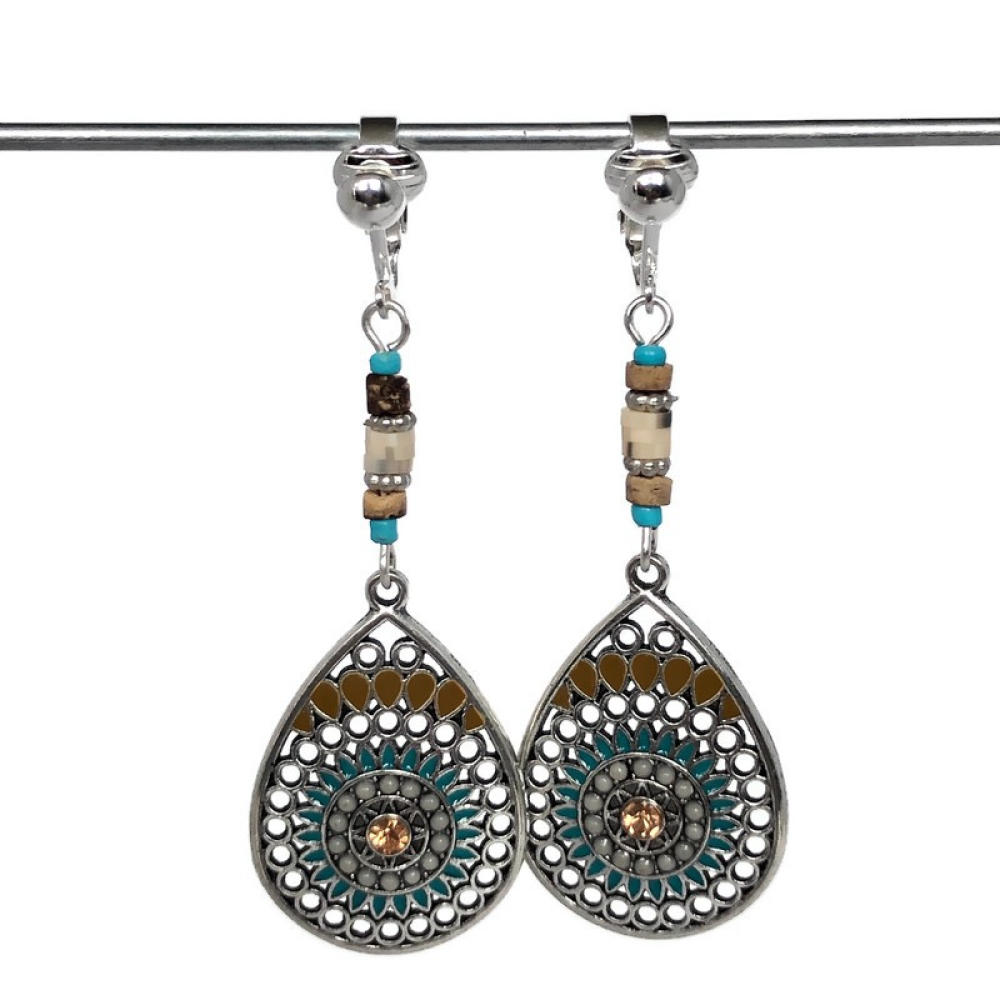 Clipoorbellen boho-chic, druppel turquoise-beige met kraaltjes, hangoorbellen
