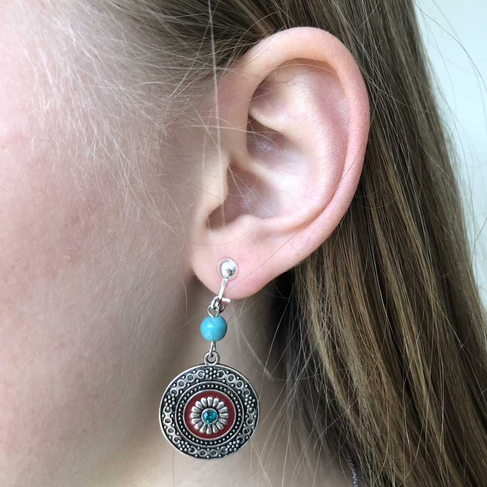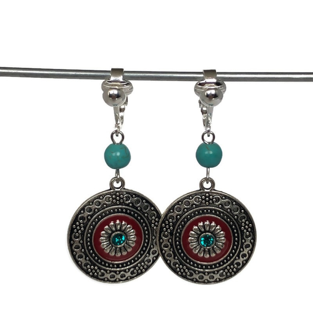 Clipoorbellen boho-chic, rond turquoise-rood met kraal, hangoorbellen