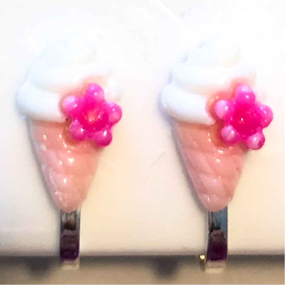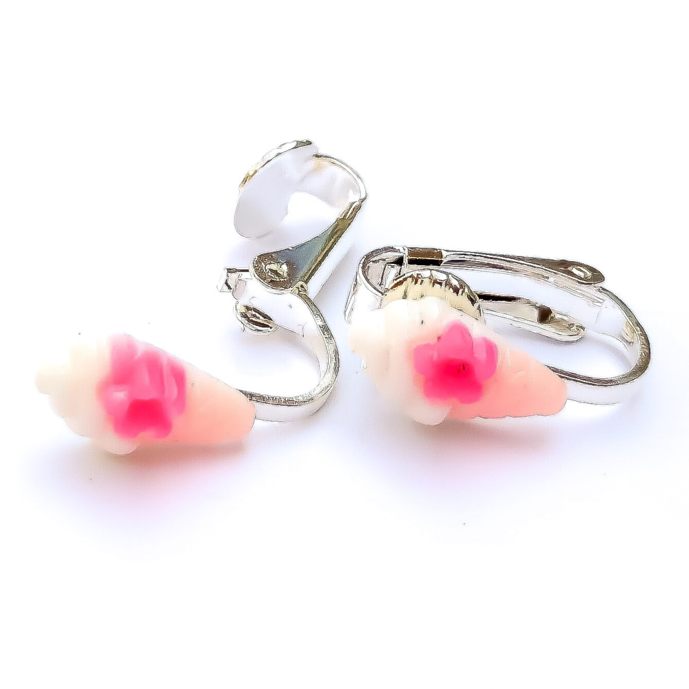 Superschattige ijsje clipoorbellen. Dit ijsjesoorbelletje is een knopje en hangt dus niet. De grootte is ongeveer 10x6 mm en wordt gewoon op het oorlelletje geklemd.