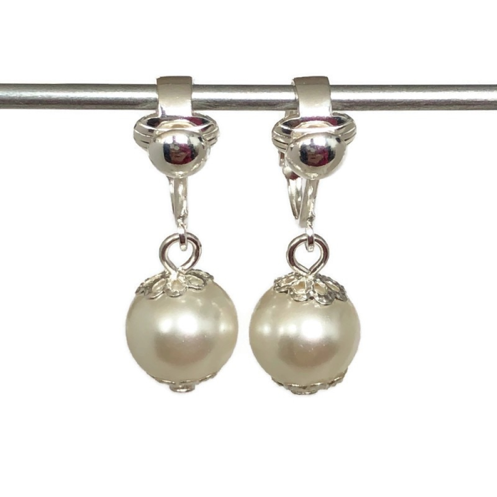 Het clipje en de kapjes zijn verzilverd. De lengte is ongeveer 2,5 cm (gemeten vanaf de bovenkant van het oorknopje) en de kunststof parel is 1,0 cm in de rondte.