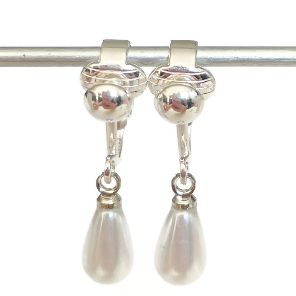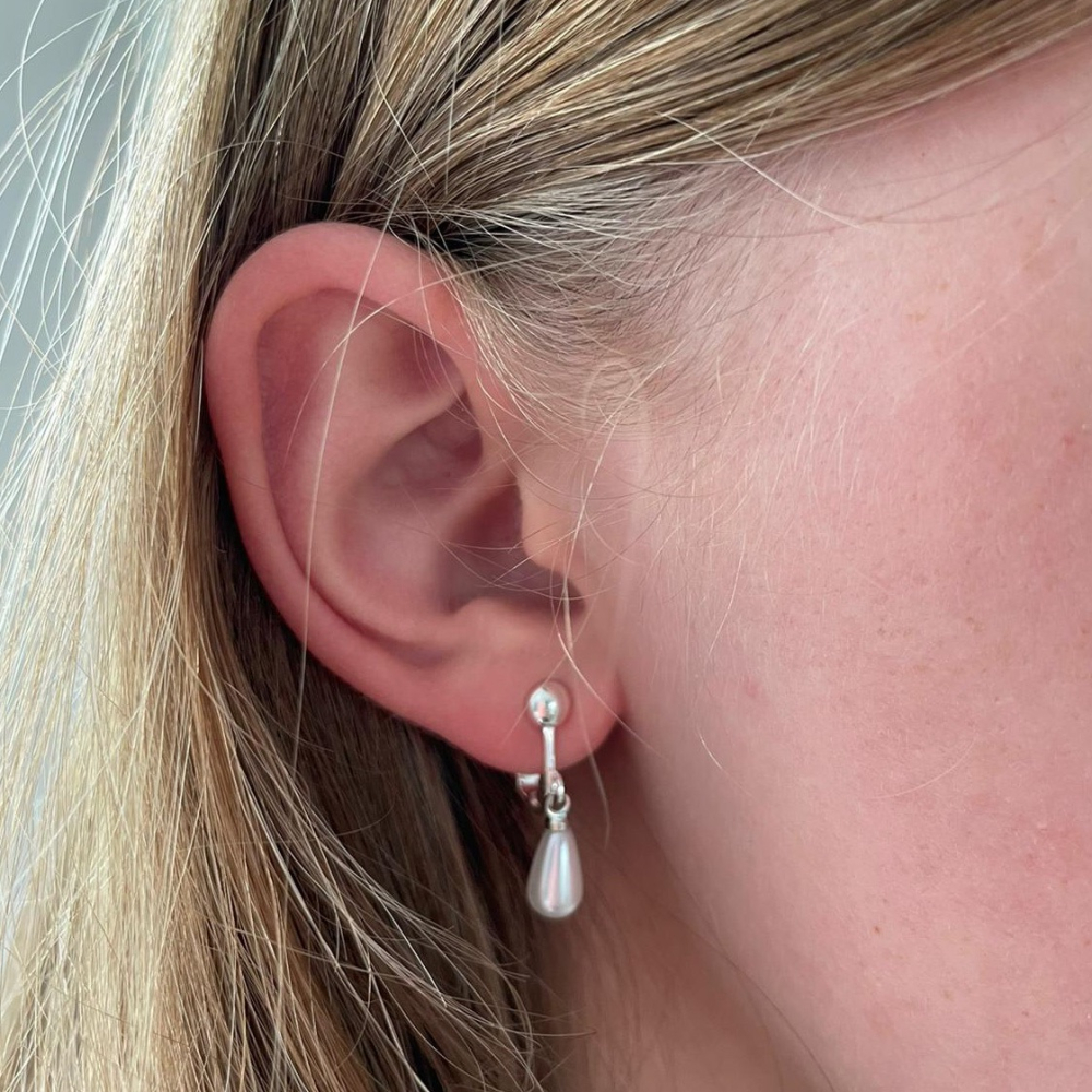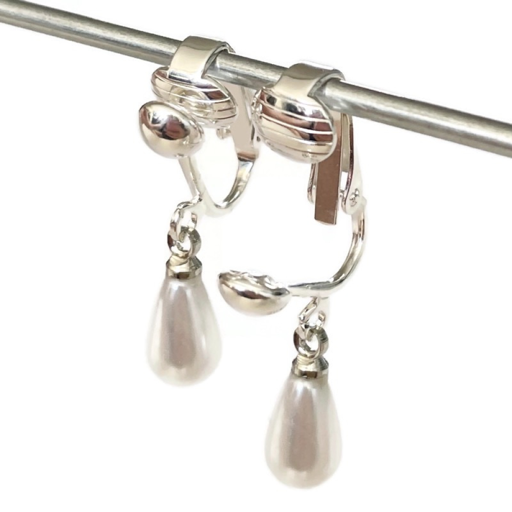 Het clipje is verzilverd. De lengte is ongeveer 2,1 cm (gemeten vanaf de bovenkant van het oorknopje) en de kunststof parel is 0,5x1,0 cm in de rondte.