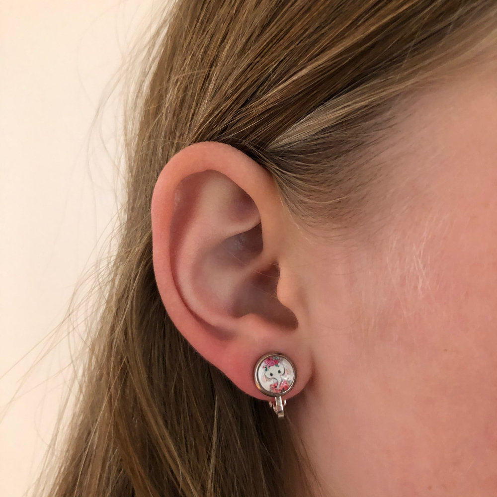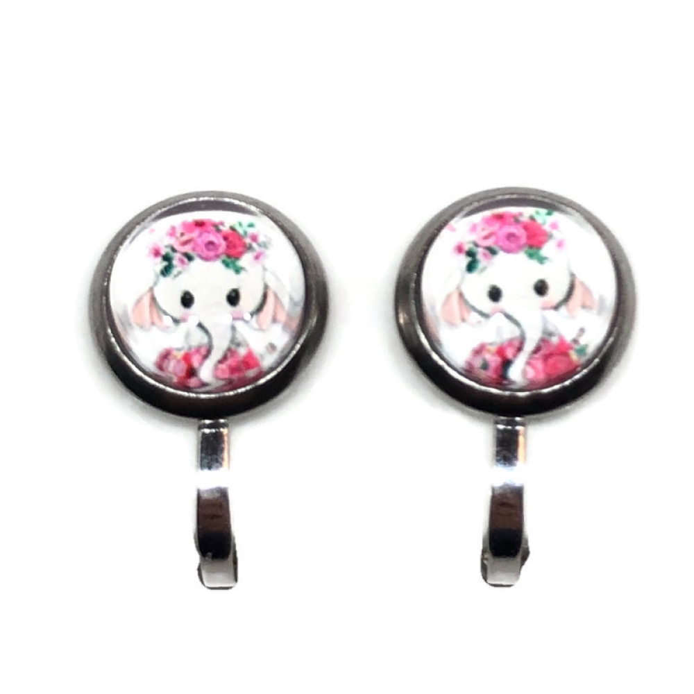 Hoe snoezig zijn deze olifanten met roze bloemetjes oorbellen. Hier als knopje. Ze zijn maar 8mm groot. Het clipje is verzilverd, het houdertje waar de olifantjes in zitten is zilverkleurig.