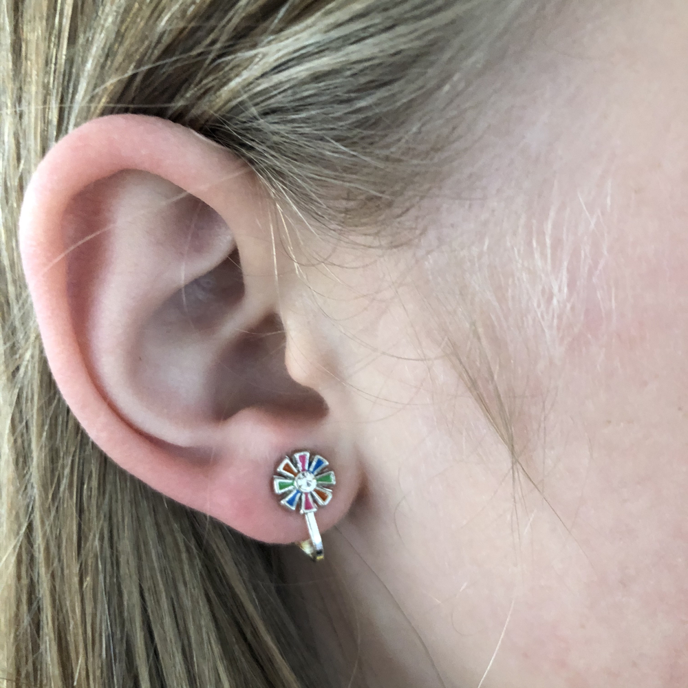 Het regenboogbloemetje op deze leuke clipoorbellen is 9 mm en klemt direct op het oorlelletje.
