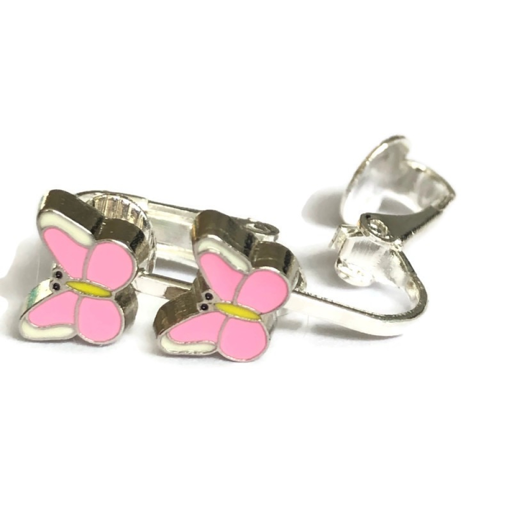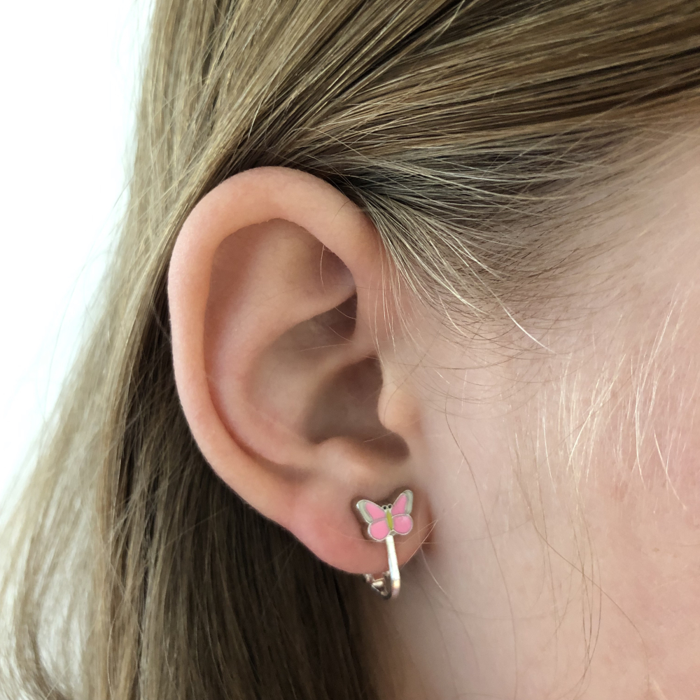 Dit oorbelletje is een knopje en hangt dus niet. De grootte van het vlindertje is ongeveer 9x6 mm en wordt gewoon op het oorlelletje geklemd.