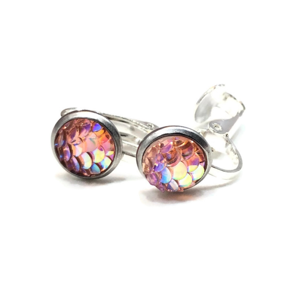Superschattige zeemeerminschubben-clipoorbellen. De schubben zijn knopjes en zijn ook mogelijk als hangoorbellen. De kleur van de schubben wisselen. Het ligt er net aan hoe je er naar kijkt.