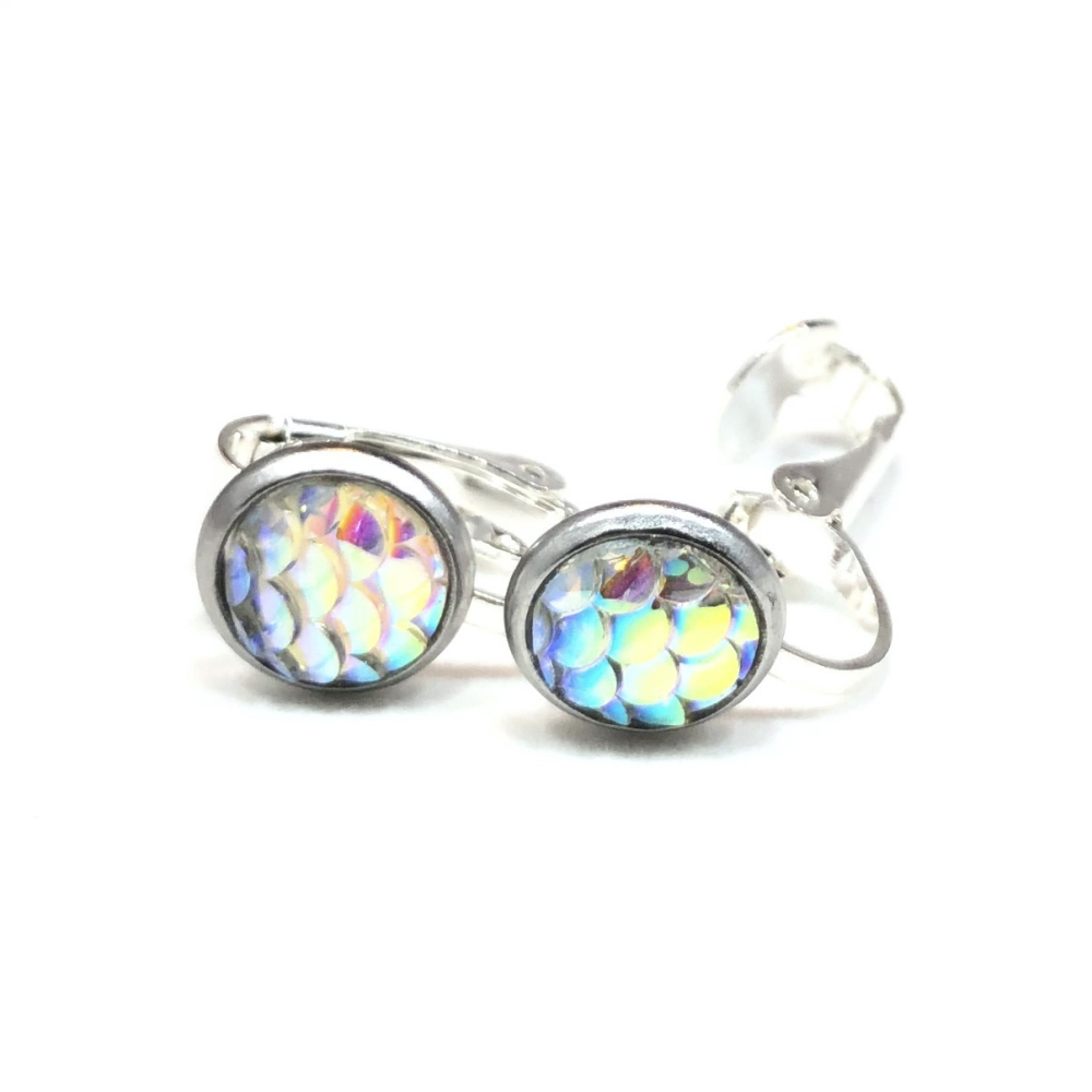 Superschattige zeemeerminschubben-clipoorbellen. De schubben zijn knopjes en zijn ook mogelijk als hangoorbellen. De kleur van de schubben wisselen. Het ligt er net aan hoe je er naar kijkt. De witte lijken soms net lichtroze.