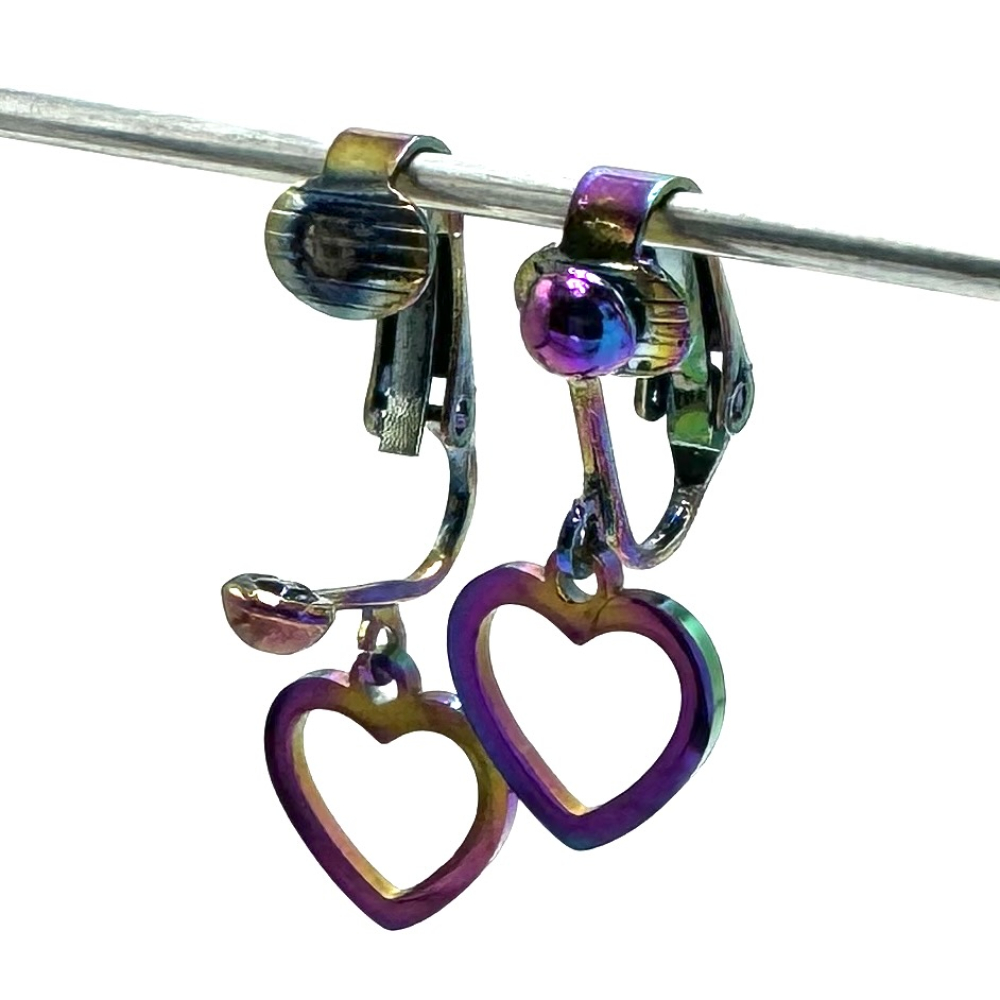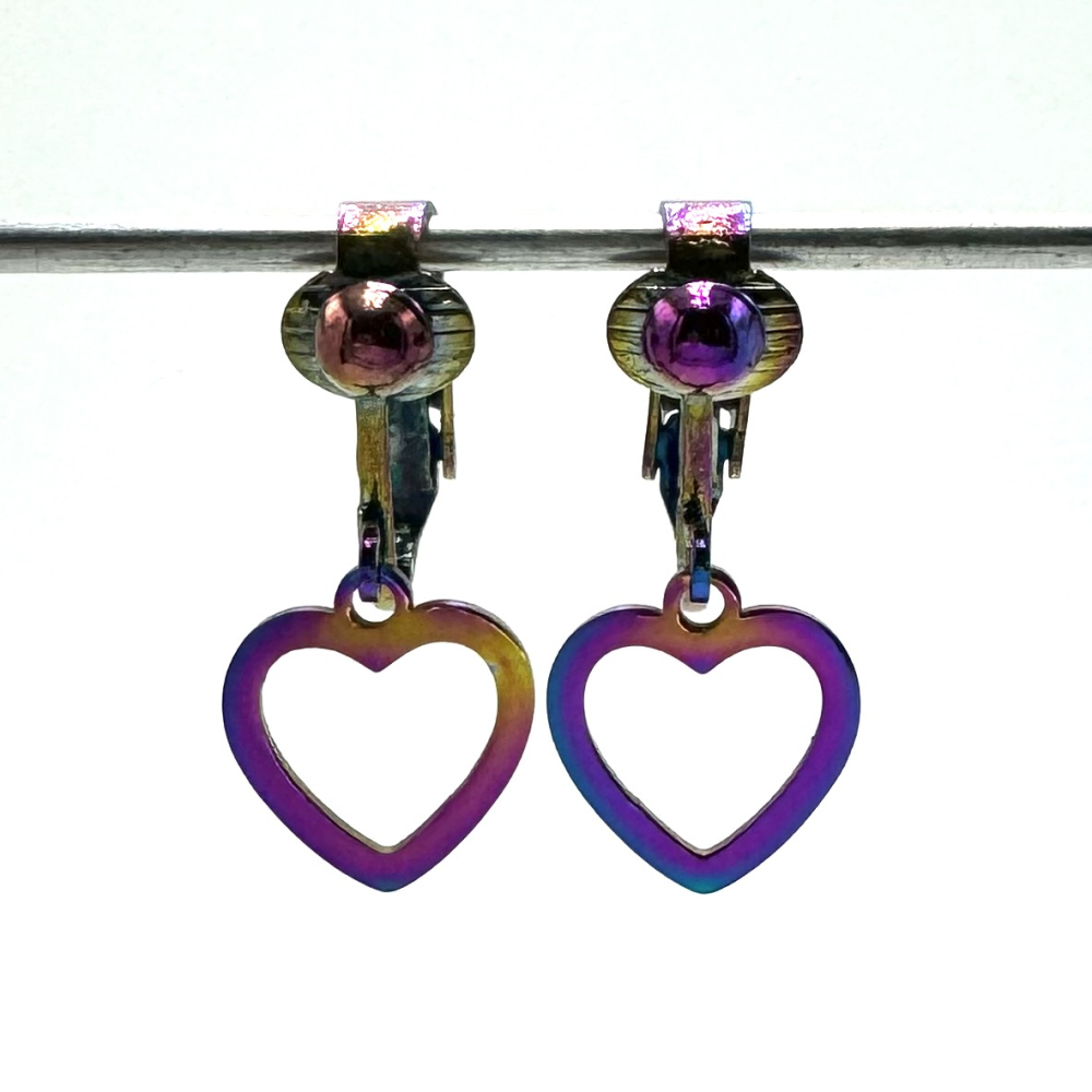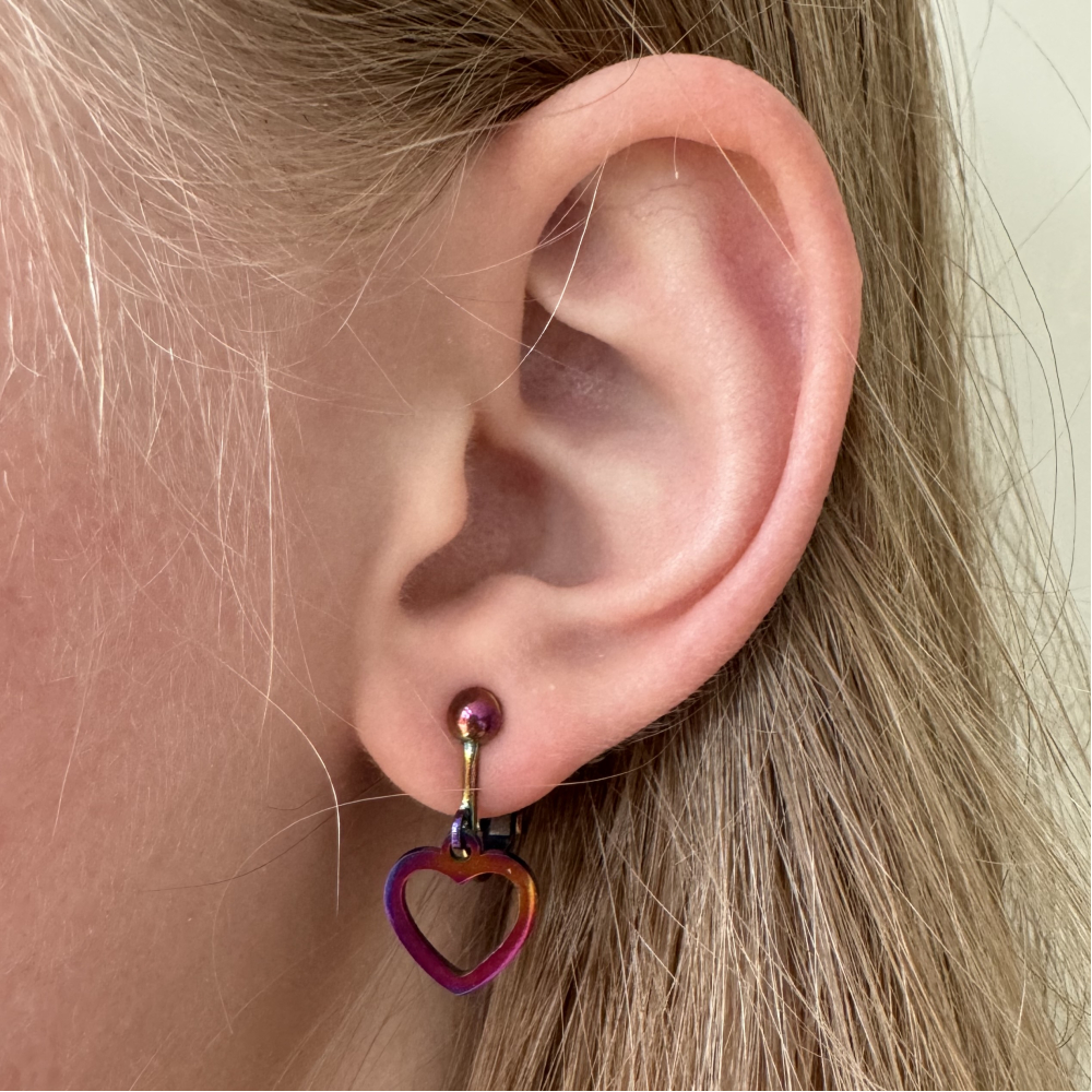 Het clipje en het hartje is stainless steel met een Ion Plating regenboogkleurig laagje en zijn heel licht in gewicht. De oorbellen zijn handgemaakt.