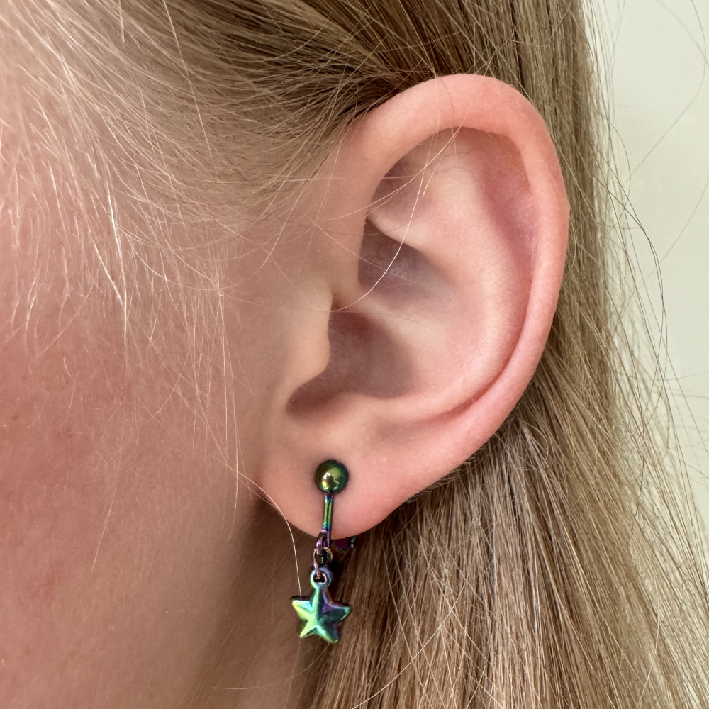 De oorbellen zijn van stainless steel met een Ion Plating regenboogkleurig laagje en zijn licht in gewicht, waardoor het heel comfortabel draagt. De oorbellen zijn handgemaakt.